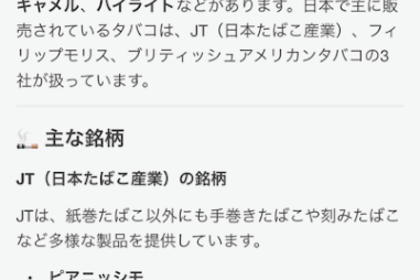・日本たばこ銘柄:主に日本たばこ産業(JT)が製造・販売している製品です。多くの人気ブランドがあります。 ・外国たばこ銘柄:幅広い種類の外国たばこも取り扱っています。 ・CAPたばこ銘柄:カプセルを...