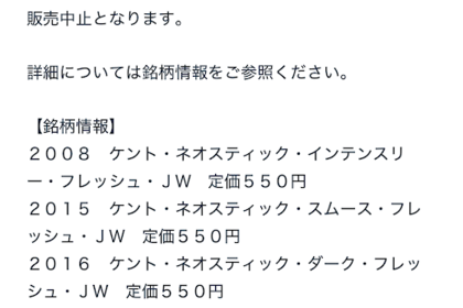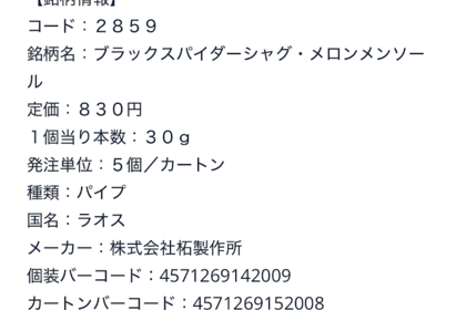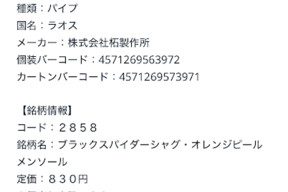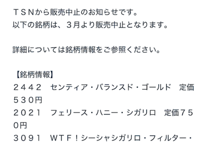売尽中止についてのお知らせです。 以下の銘柄につきましては在庫がなくなり次第、販売中止となります。 【銘柄情報】 3734 キャプテンブラック シャグチェリー 定価920円 3735 キャプテンブラック...