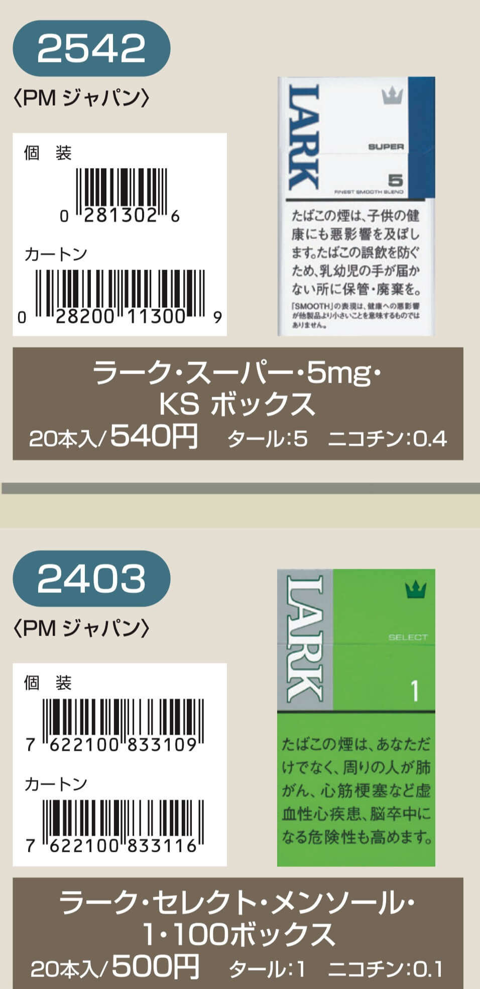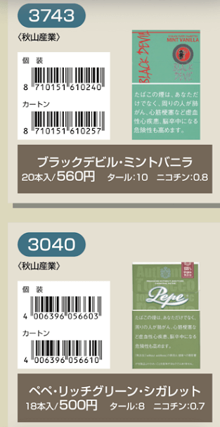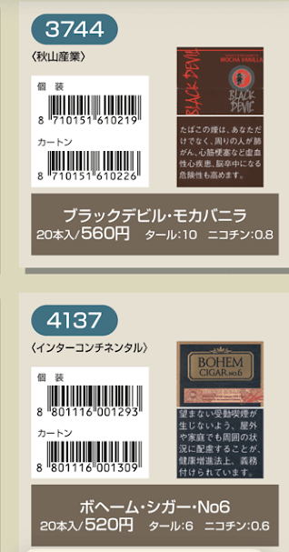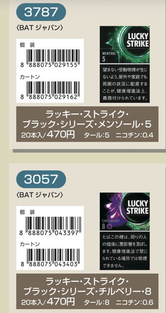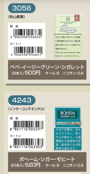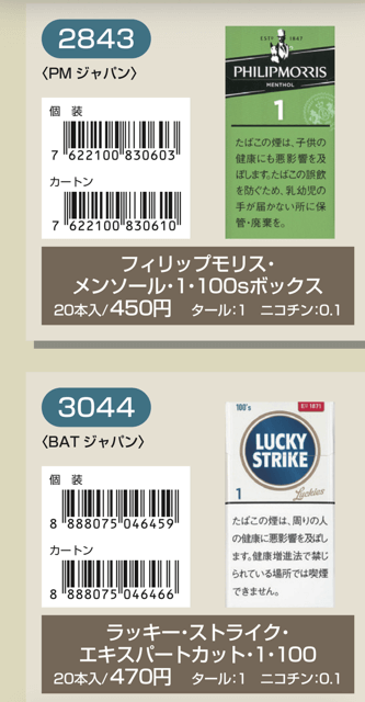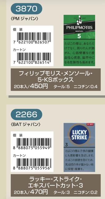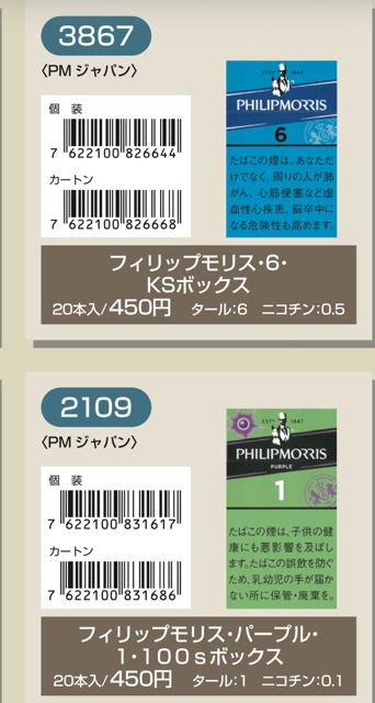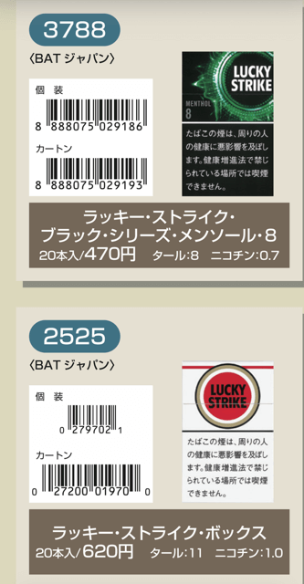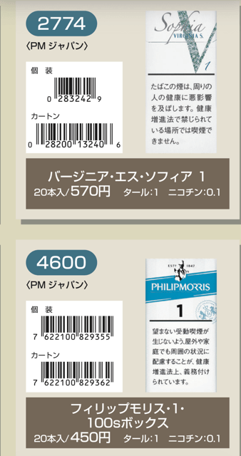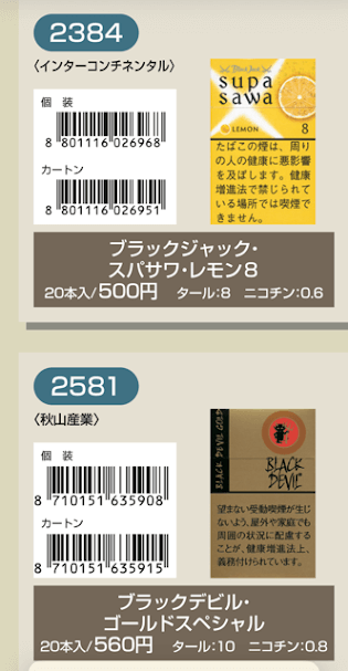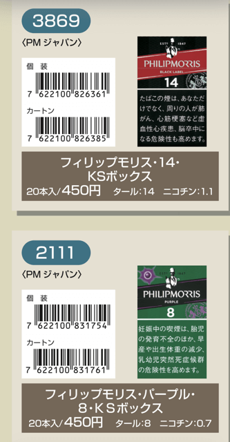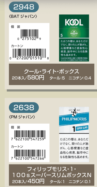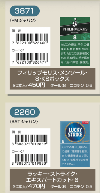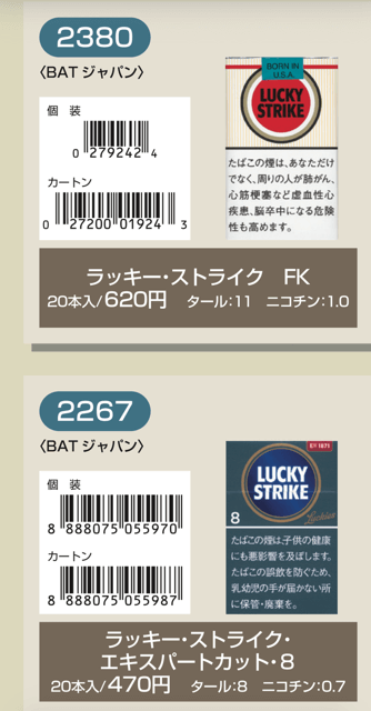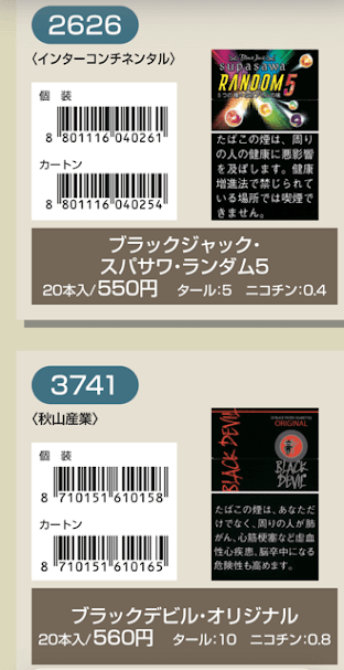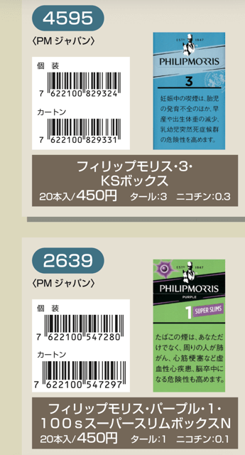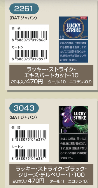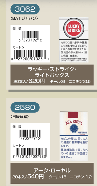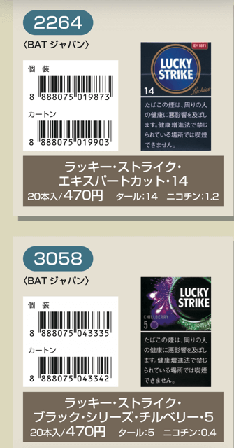 マールポロ:マールボロ・ブラスト・メガ・8・ボックス:マールボロ・ボックス:マールボロ・クリア・ハイブリッド・スリー・ボックス:マールボロ・アイス・ブラスト・メガ・1・ボックス:マールボロ・ゴールド・ボックス:マールボロ・アイス・ブラスト・メガ・5・ボックス:マールボロ・ゴールド・100s・ボックス:マールボロ・ダブル・バースト・5・ボックス:マールボロ・メンソール・4・ボックス:マールボロ・トロピカル・スプラッシュ・8・ボックス:マールボロ・メンソール・8・ボックス:マールボロ・ブラック・メンソール・8・ボックス:マールボロ・メンソール・8・100s・ボックス:マールボロ・ミディアム・ボックス:マールボロ・メンソール・12・ボックス:ラーク・KSボックス:ラーク・エクストラ・3mg・KSボックス:ラーク・100ボックス:ラーク・エクストラ・3mg・100ボックス:ラーク・ウルトラ・1mg・KSボックス:ラーク・クラシック・マイルド・KSボックス:ラーク・ウルトラ・1mg100ボックス:ラーク・スーパー・マイルド・100ボックス:ラーク・スーパー・5mg・KSボックス:ラーク・セレクト・メンソール・1・100ボックス:ラーク・スーパー・5mg・100ボックス:ラーク・セレクト・メンソール・5・100ボックス:ラーク・セレクト・1・100ボックス:ラーク・ハイブリッドKSボックス:ラーク・セレクト・パープル・1・100ボックス:ラーク・マイルド・KSボックス:ラーク・マイルド・100ボックス:ケント・6・100・ボックス:ケント・1・KS・ボックス:ケント・アイ・ブースト・1・100・ボックス:ケント・1・100ボックス:ケント・エス・シリーズ・スパーク・1・100・ボックス:ケント・3・100・ボックス:ケント・エスシリーズ・スパーク・5・100・ボックス:ケント・エス・シリーズ・スパーク・ミント・1・100・ボックス:ケント・エス・シリーズ・1・100・ボックス:ケント・エス・シリーズ・スパーク・ミント・5・100・ボックス:ケント・エス・シリーズ・3・100・ボックス:ケント・エス・シリーズ・スパーク・メロー・1・100・ボックス:パーラメント・KSボックス:ケント・エス・シリーズ・メンソール・1・100・ボックス:パーラメント・100ボックス:パーラメント・エクストラ・ライト・100ボックス:クール・FX・ボックス:パーラメント・ライト・KSボックス:クール・ブースト・フレッシュ・5・ボックス:パーラメント・ライト・100ボックス:クール・ブースト・フレッシュ・8・ボックス:パーラメント・ワン・100ボックス:クールマイルド・FX・ボックス:クール・ミンティブースト・8:バージニア・エス・ソフィア6:クール・ミンティ・シリーズ・ミンティベリー・5:バージニア・エス・ロゼ・メンソール:クール・ライト・ボックス:フィリップモリス・1・100sスーパースリムボックスN:バージニア・エス・ソフィア1:フィリップモリス・1・100sボックス:フィリップモリス・3・KSボックス:フィリップモリス・パープル・1・100sスーパースリムボックスN:フィリップモリス・6・KSボックス:フィリップモリス・パープル・1・100sボックス:フィリップモリス・10・KSボックス:フィリップモリス・パープル・5・KSボックス:フィリップモリス・14KSボックス:フィリップモリス・パープル・8・KSボックス:フィリップモリス・メンソール・1・100sボックス:ラッキー・ストライク・エキスパートカット・1・100:フィリップモリス・メンソール・5・KSボックス:ラッキー・ストライク・エキスパートカット・3:フィリップモリス・メンソール・8・KSボックス:ラッキー・ストライク・エキスパートカット・6:ラッキー・ストライク・FX:ラッキー・ストライク・エキスパートカット・8:ラッキー・ストライク・エキスパートカット・10:ラッキー・ストライク・ブラック・シリーズ・チルベリー・1・100:ラッキー・ストライク・エキスパートカット・14:ラッキー・ストライク・ブラック・シリーズ・チルベリー・5:ラッキー・ストライク・ブラック・シリーズ・メンソール・・5:ラッキー・ストライク・ブラック・シリーズ・チルベリー・8:ラッキー・ストライク・ブラック・シリーズ・メンソール・8:ラッキー・ストライク・ボックス:ラッキー・ストライク・ライト・ボックス:アーク・ロイヤル:WIN1:アーク・ロイヤル・アップル・ミント:WIN3:アーク・ロイヤル・スイート:WIN5:アーク・ロイヤル・パラダイス・ティー:アーク・ロイヤル・パラダイス・ティー・スリム・1:チェ・グリーン・メンソール・アーク・ロイヤル・ブラック・チョコレート:チェ・ブラック:アーク・ロイヤル・ワイルド・カード:チェ・ブラック・メンソール:ジェー・ピー・KSボックス:チェ・ブランコ:チェ・レッド:中南海・ライト:チェ・ワン・メンソール:中南海・ワン:中華ボックス:中南海・ワン・メンソール:中南海・スーパー・ライト:バイブス:プエブロ・ナチュラル・6:ブラックジャック・スパサワ・グレープフルーツ5:プエブロ・ナチュラル・10:ブラックジャック・スパサワ・パイナップル8:ブライト・ロング・1:ブラックジャック